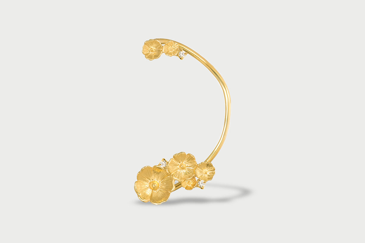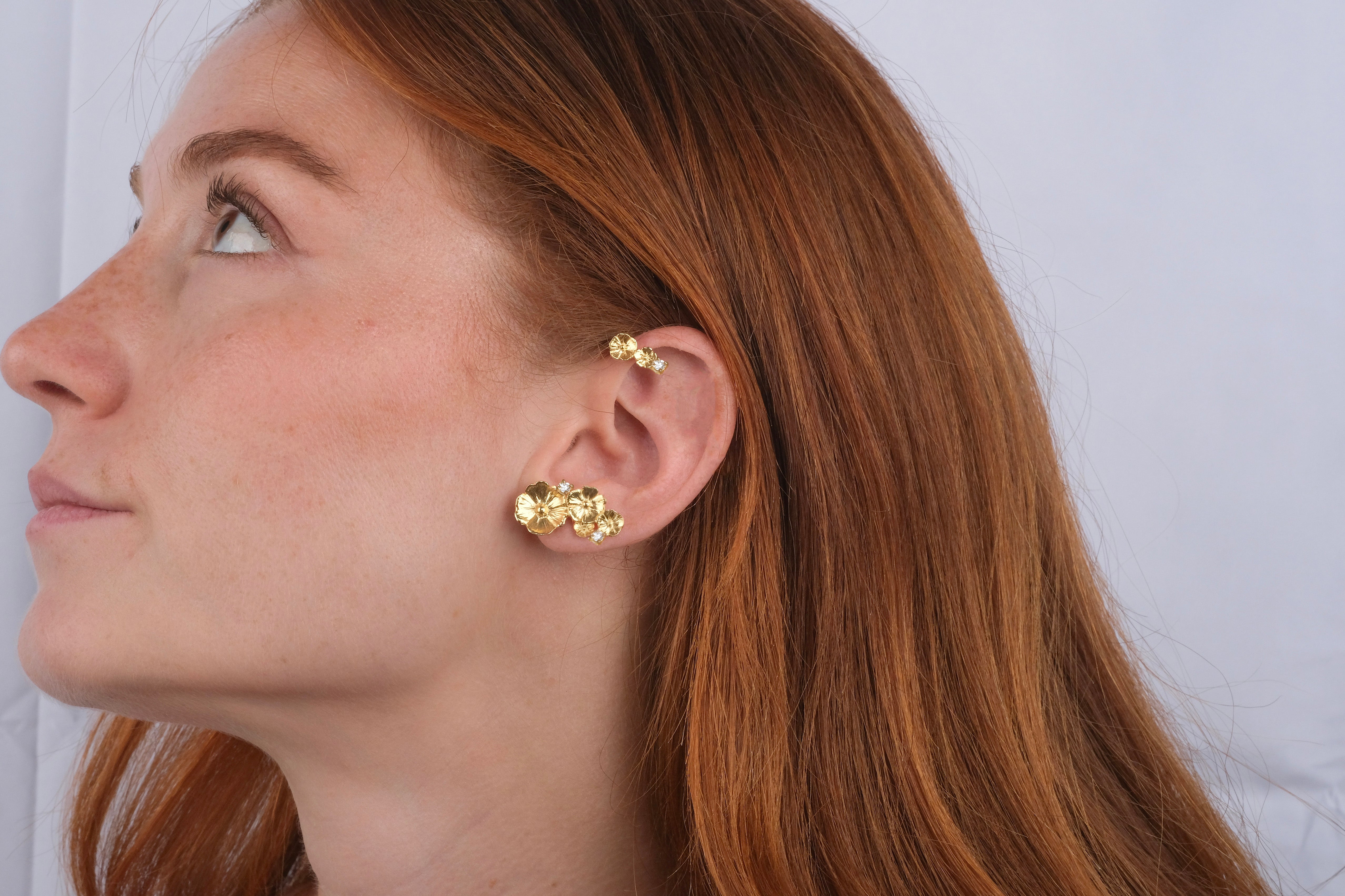 Una composizione di fiori impreziosita da punti luce avvolgono l'orecchio.